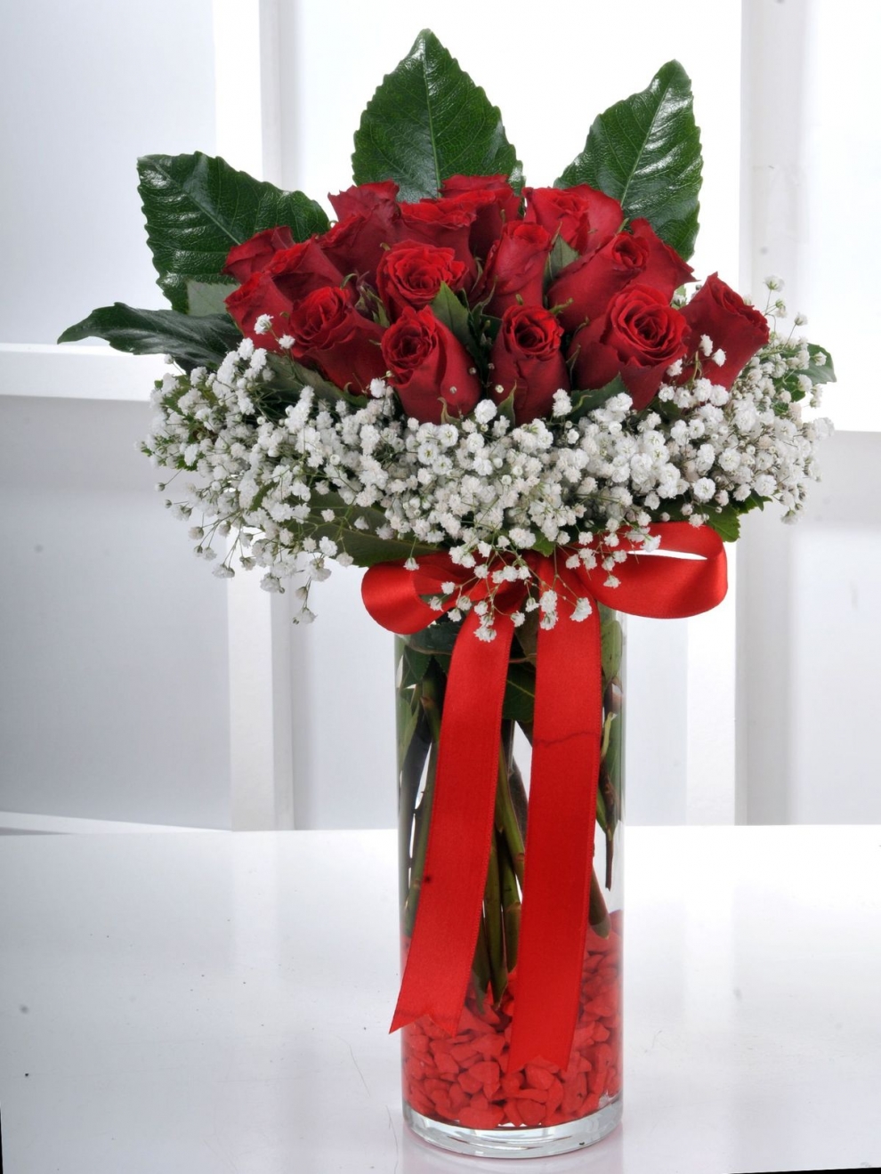 cam vazoda hazırlanmış 17 kırmızı gül aranjmanı