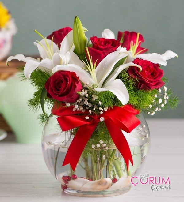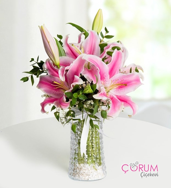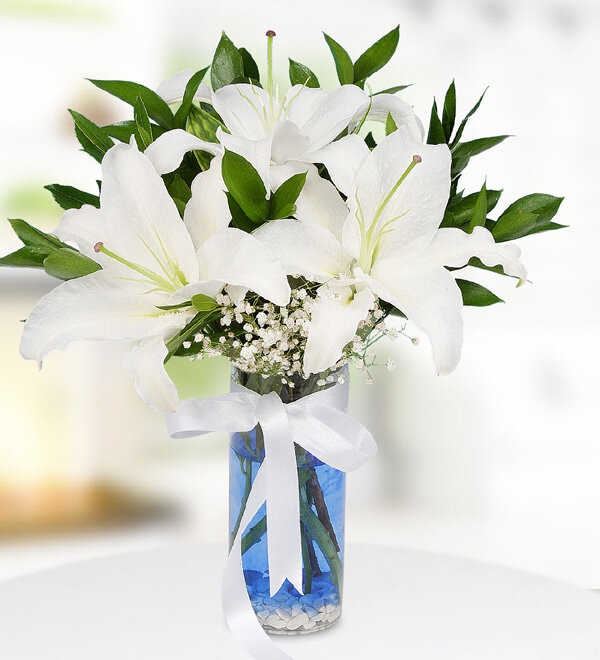 Silindir Vazo Mavi Su Lilyumlar 4 Adet